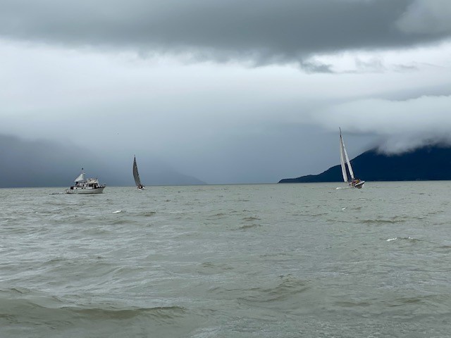 Committee boat Juniebell had a mechanical issue and turned back to Juneau for repairs (new alternator) an hour after the start. Sea state went from flat and calm to a stiff breeze by Grand Island. Juniebell ran back to town for parts and met up with the fleet at Holcomb Bay around 11:30pm. Reportedly Surprise and A Little Romance Sailed more than half of this leg before motoring on. Surprise caught 19 Dungeness Crab at Holcomb Bay that afternoon (wow!).